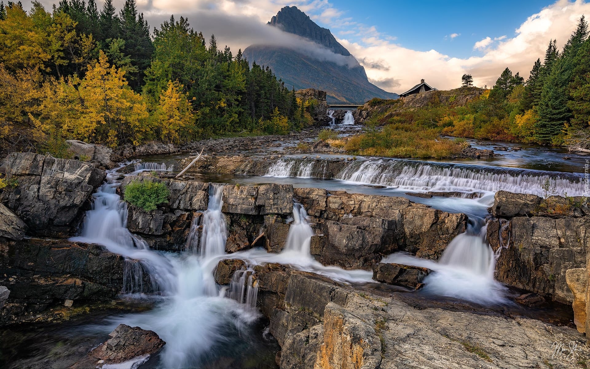 Tagi: Stany Zjednoczone, Stan Montana, Park Narodowy Glacier, Wodospad, Swiftcurrent Falls, Góry, Skały, Drzewa, Jesień, Rzeka