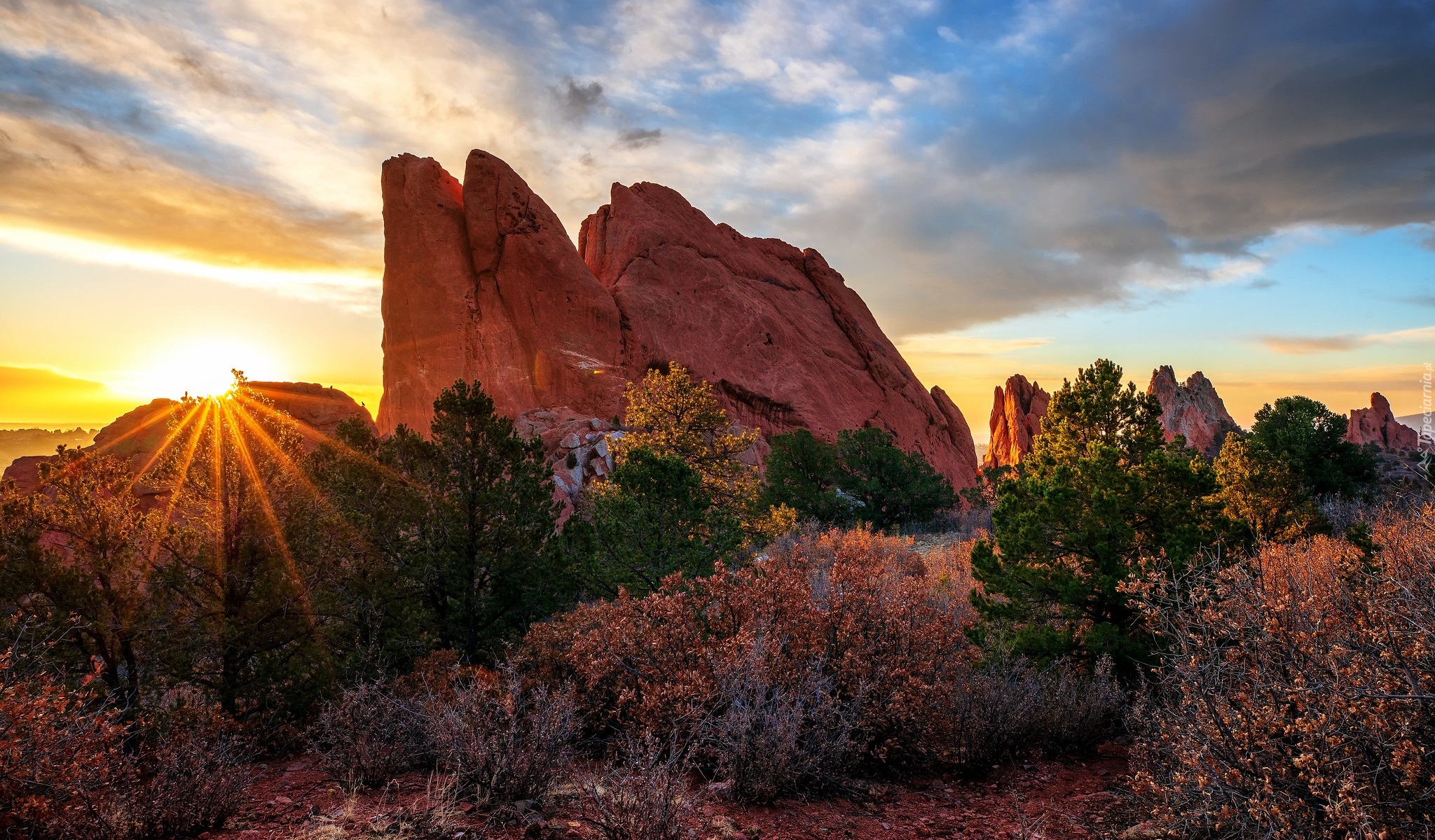 Tagi: Stany Zjednoczone, Kolorado, Garden of the Gods, Góry, Skały, Drzewa, Promienie słońca
