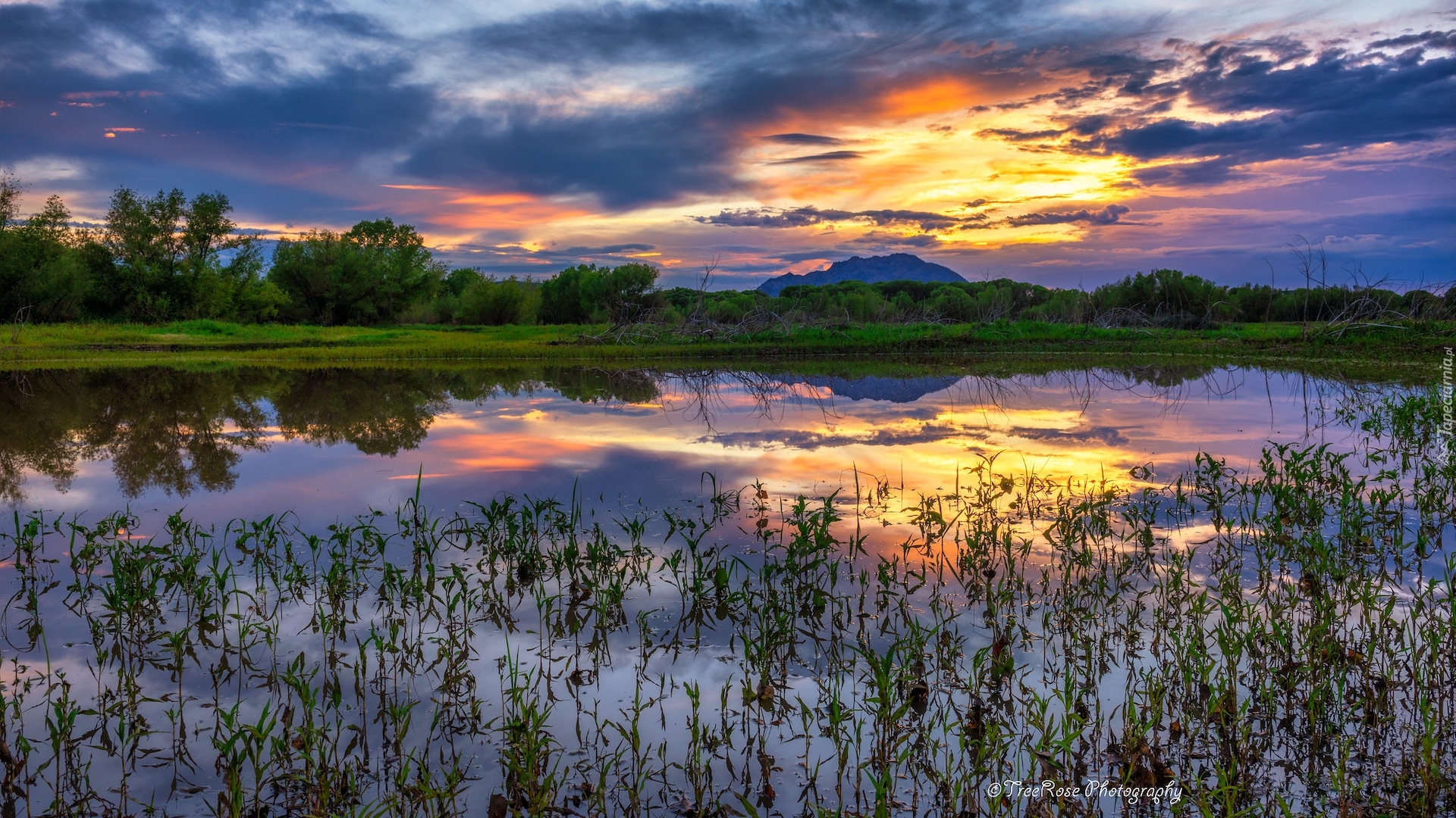 Tagi: Stany Zjednoczone, Arizona, Hrabstwo Yavapai, Prescott, Jezioro, Willow Lake, Trawy, Zachód słońca, Odbicie