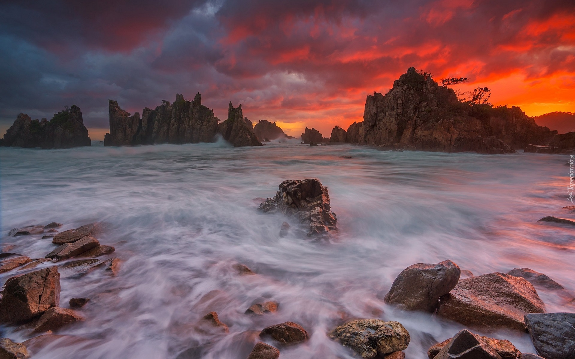 Tagi: Indonezja, Kelumbayan, Prowincja Lampung, Gigi Hiu Kelumbayan, Skały, Morze, Kamienie, Zachód słońca