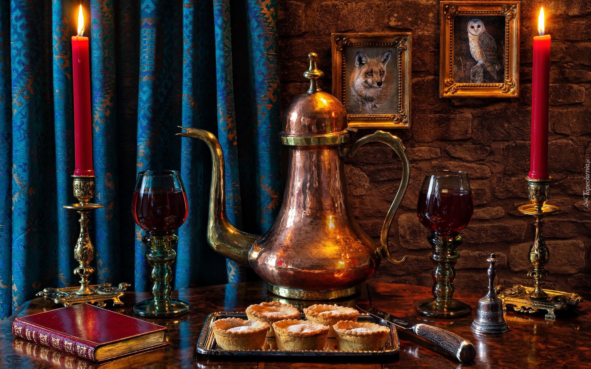 Kompozycja, Dzbanek, Świece, Książka, Obraz, Babeczki, Kieliszki