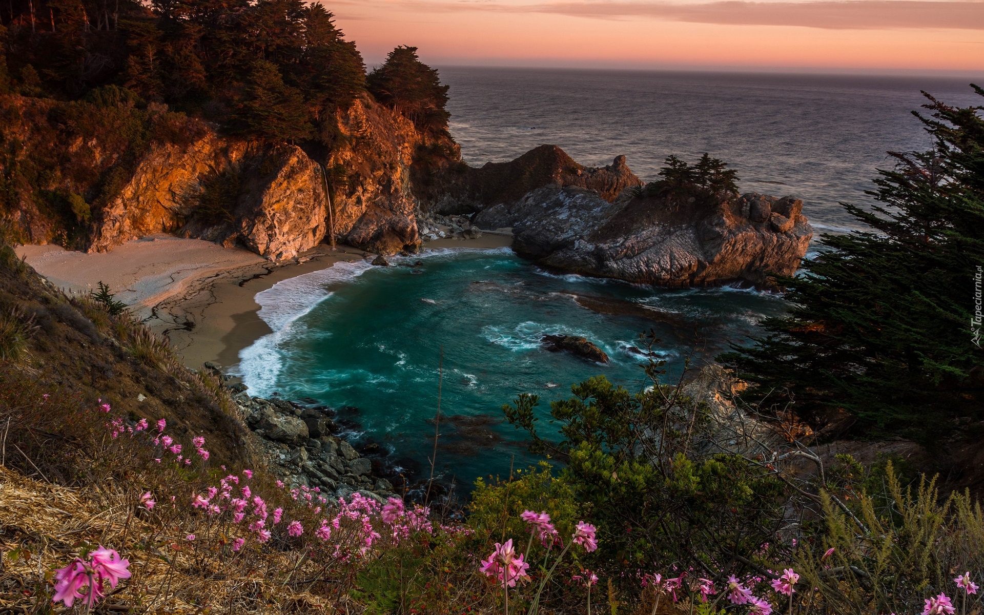 Tagi: Stany Zjednoczone, Stan Kalifornia, Wybrzeże Big Sur, Góry Santa Lucia, Park Stanowy Julia Pfeiffer Burns, Wodospad McWay Falls, Zatoka, Plaża, Skały, Drzewa, Kwiaty