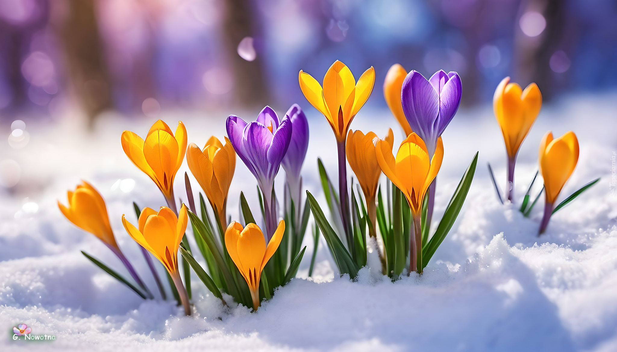 Żółte i fioletowe krokusy w śniegu