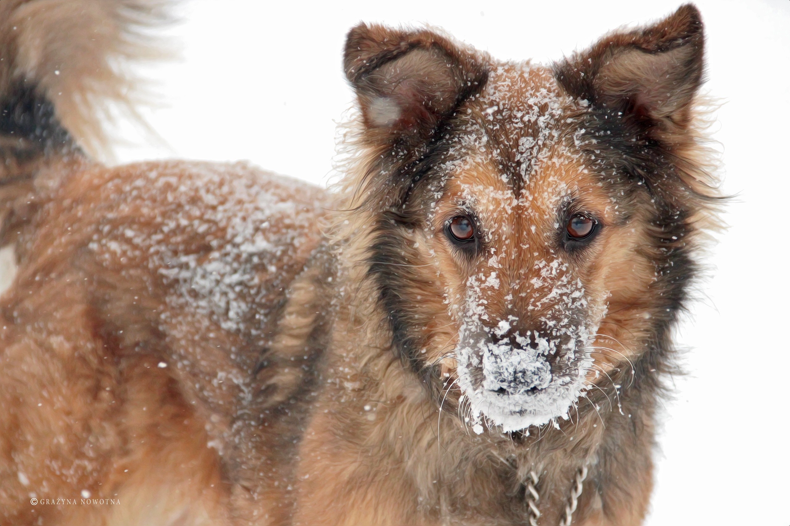 Słodkie foto...piesek lubi zabawy w śniegu:)